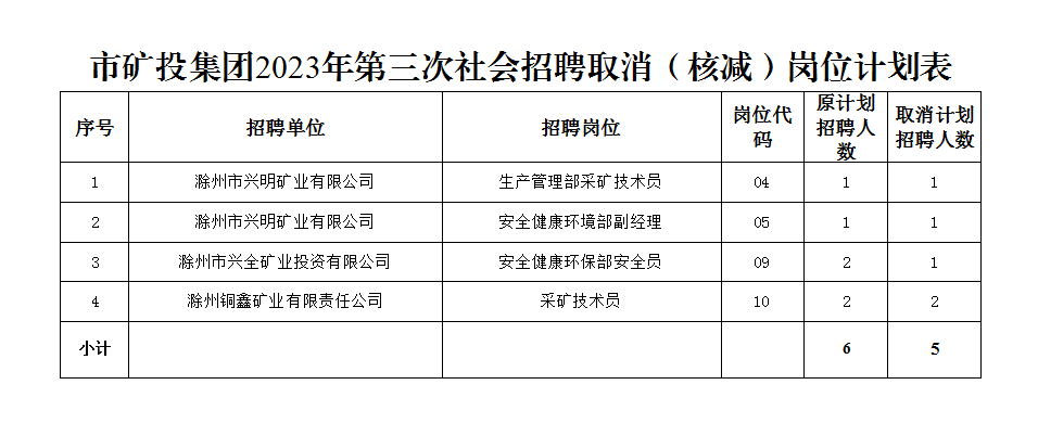 根據(jù)《滁州市興滁礦業(yè)投資集團(tuán)有限公司2023年第三次社會(huì)招聘公告》規(guī)定,經(jīng)對(duì)各崗位報(bào)名情況篩查審定,結(jié)合資格復(fù)審情況,部分崗位報(bào)名情況未達(dá)到開(kāi)考比例,經(jīng)研究決定取消(核減)以下崗位招聘計(jì)劃: